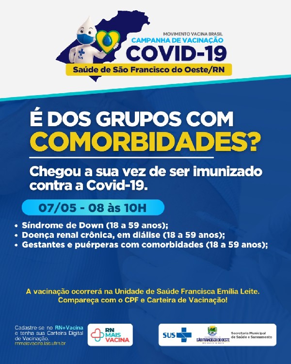 É importante que faça o seu cadastro no RN+Vacina (https://rnmaisvacina.lais.ufrn.br/) e insira o comprovante da sua comorbidade (receitas, exames ou prescrições médicas). No dia da vacinação, compareça com CPF, Carteira de Vacinação e o comprovante da comorbidade.