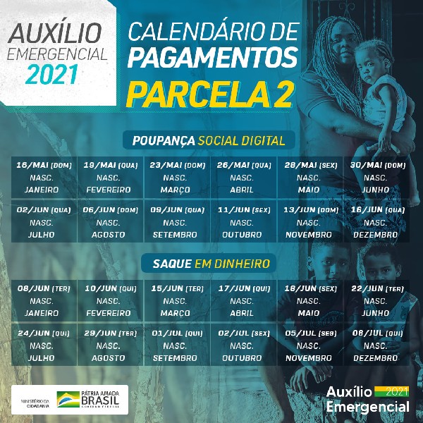 O Ministério da Cidadania disponibilizou o calendário completo do novo Auxílio Emergencial 2021. Serão 4 parcelas de R$ 250. A mulher chefe de família receberá parcelas de R$ 375. Pessoas que moram sozinhas vão receber R$ 150.